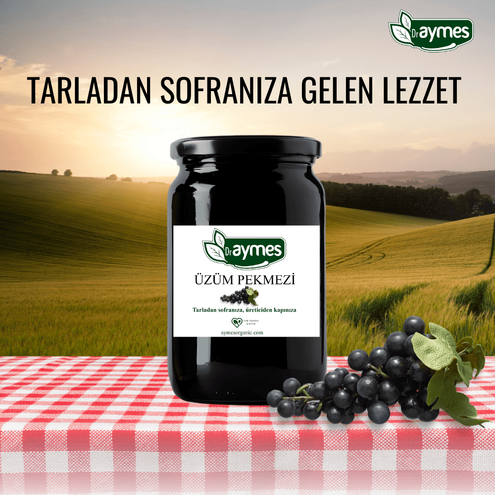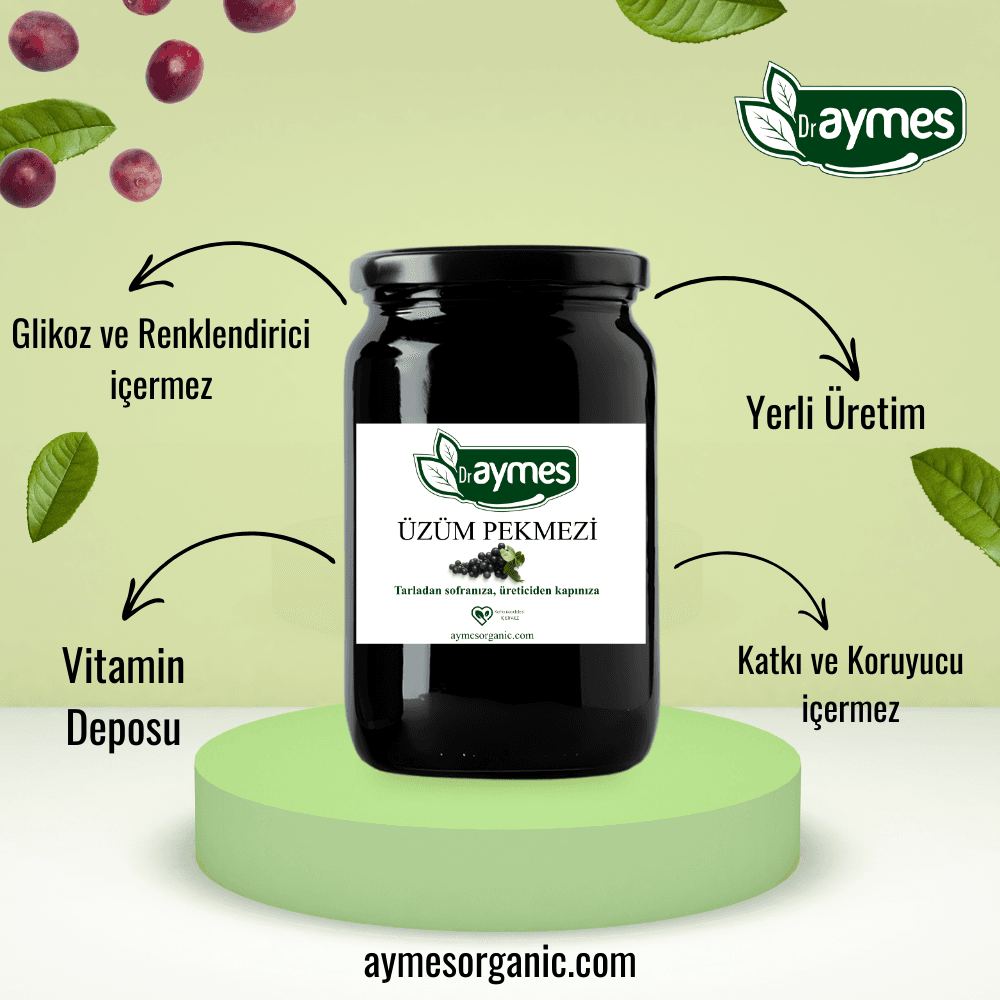 Dr. Aymes Doğal Üzüm Pekmezi, özenle seçilen %100 organik üzümlerden elde edilmiştir. Geleneksel yöntemlerle katkısız üretilen bu pekmez, zengin besin içeriği sayesinde enerji kaynağıdır ve doğal tatlılığıyla öne çıkar. Vitamin ve mineraller açısından zengin olan üzüm pekmezi, bağışıklık sistemini destekler, kansızlığa iyi gelir ve sindirimi kolaylaştırır. Kahvaltılarda, tatlılarda ve içeceklerde kullanıma uygundur.